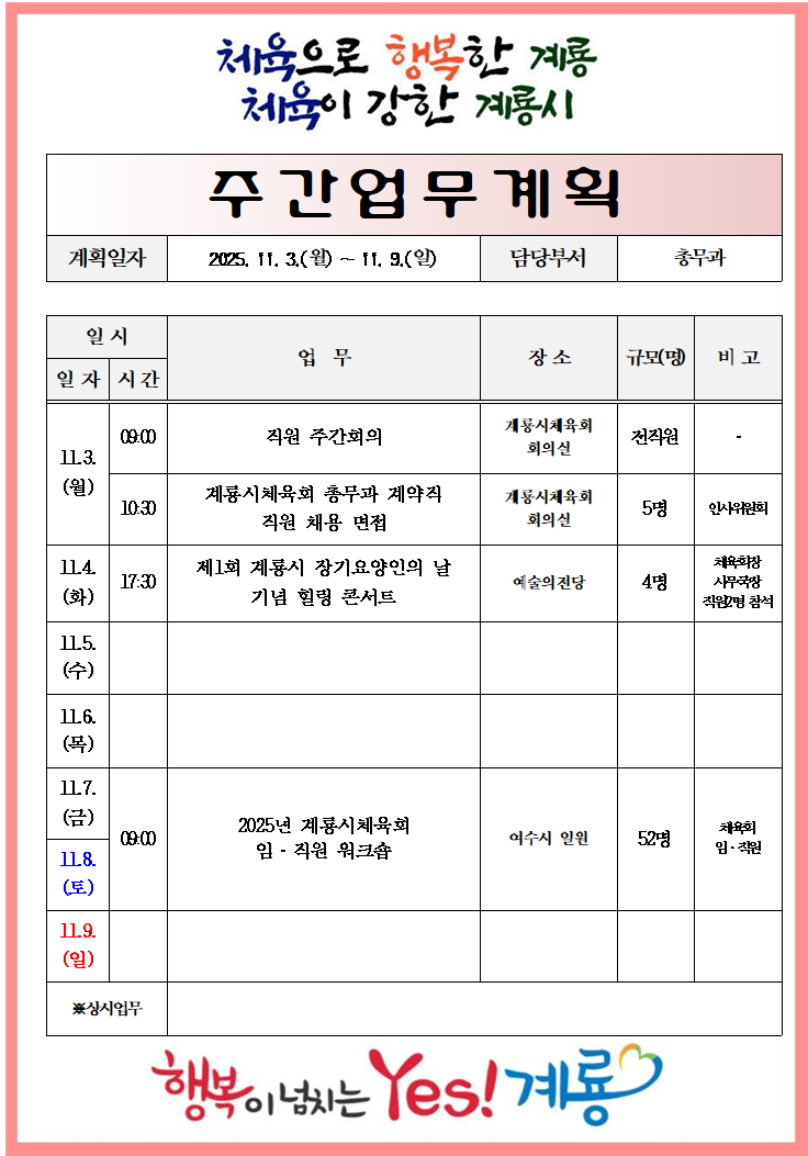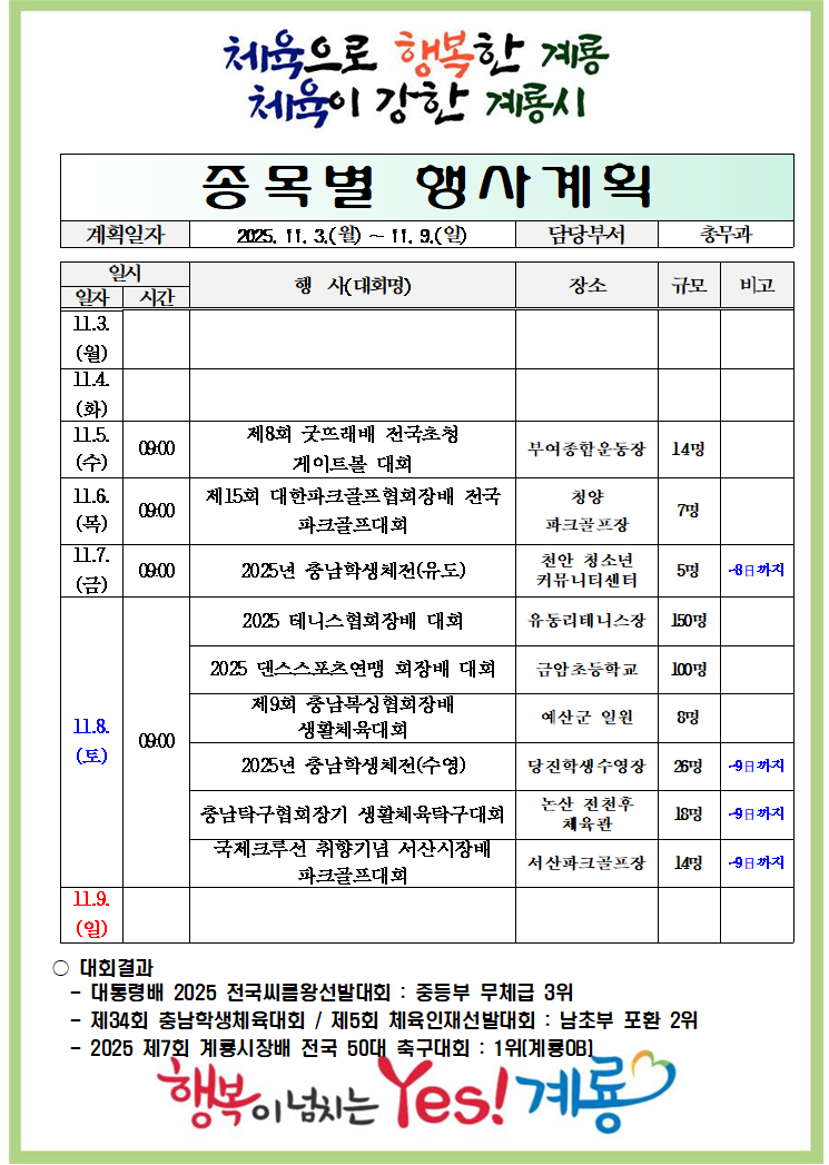 계룡시체육회 주간 계획, 행사 (11. 3. ~ 11. 9.) 페이지 정보 작성자 계룡시체육회 댓글 0건 조회 13회 작성일 25-11-03 16:39 목록 본문 [계룡시체육회 주간계획, 종목별 행사계획 안내]2025. 11. 3.(월) ~ 11. 9.(일)금주 계룡시체육회 주간계획, 종목별 행사계획을 알려드립니다.문의: 계룡시체육회(042-841-4992) 댓글 0 댓글목록 등록된 댓글이 없습니다.
