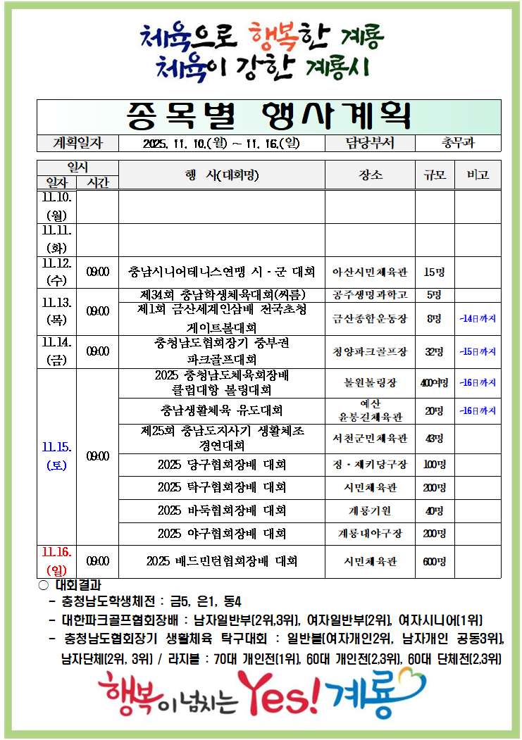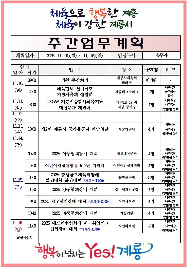 계룡시체육회 주간 계획, 행사 (11. 10. ~ 11. 16.) 페이지 정보 작성자 계룡시체육회 댓글 0건 조회 6회 작성일 25-11-17 14:50 목록 본문 [계룡시체육회 주간계획, 종목별 행사계획 안내]2025. 11. 10.(월) ~ 11. 16.(일)금주 계룡시체육회 주간계획, 종목별 행사계획을 알려드립니다.문의: 계룡시체육회(042-841-4992)#계룡시체육회 #주간계획 #주간업무 댓글 0 댓글목록 등록된 댓글이 없습니다.