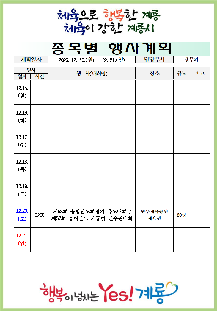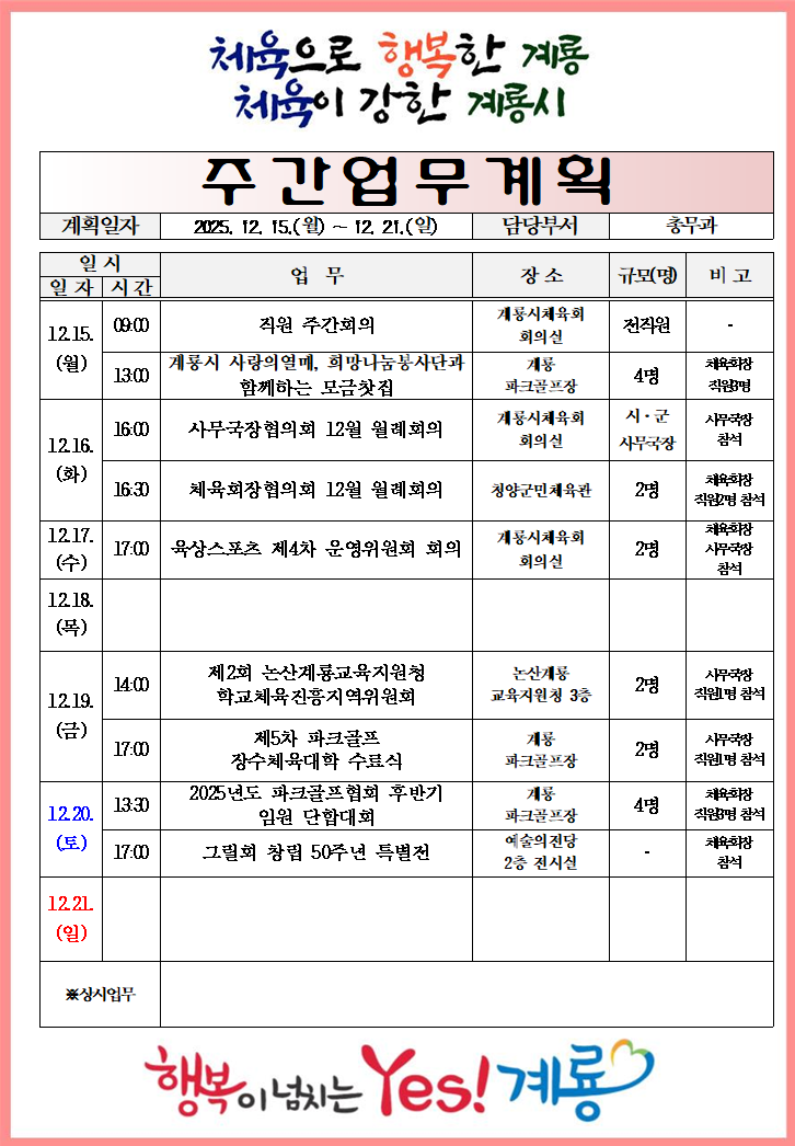 계룡시체육회 주간 계획, 행사 (12. 15. ~ 12. 21.) 페이지 정보 작성자 계룡시체육회 댓글 0건 조회 12회 작성일 25-12-15 11:05 목록 본문 [계룡시체육회 주간계획, 종목별 행사계획 안내]2025. 12. 15.(월) ~ 12. 21.(일)금주 계룡시체육회 주간계획, 종목별 행사계획을 알려드립니다.문의: 계룡시체육회(042-841-4992)#계룡시체육회 #주간계획 #주간업무 댓글 0 댓글목록 등록된 댓글이 없습니다.